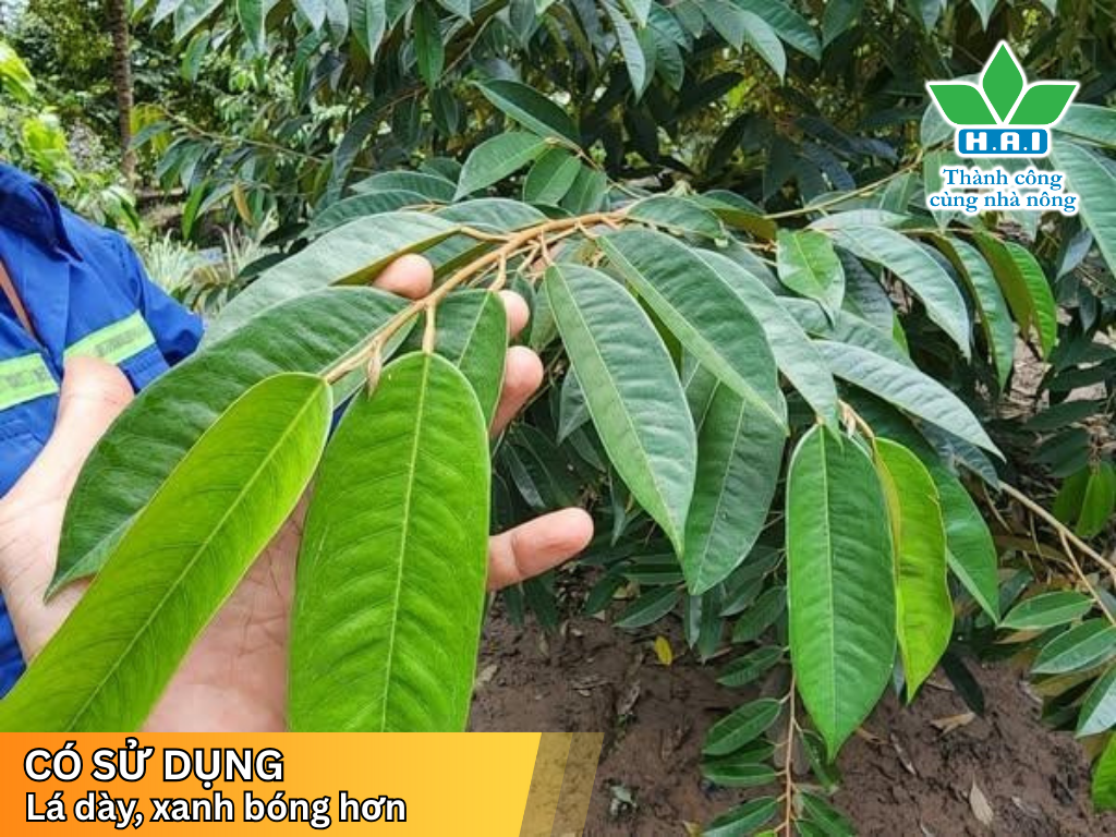 Trong quá trình trao đổi, anh Chiến đánh giá cao hiệu quả sử dụng phân bón HAI-Silicate Calcium kết hợp với thuốc điều hòa sinh trưởng Dekamon 22,43SL trong giai đoạn phục hồi cây sau thu hoạch. Bộ đôi sản phẩm này đã giúp cây sầu riêng ra rễ nhanh hơn, cải thiện pH đất và giúp bộ lá dày hơn, xanh bóng, rất khác biệt so với các cây không xử lý.