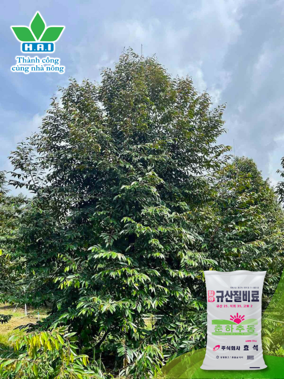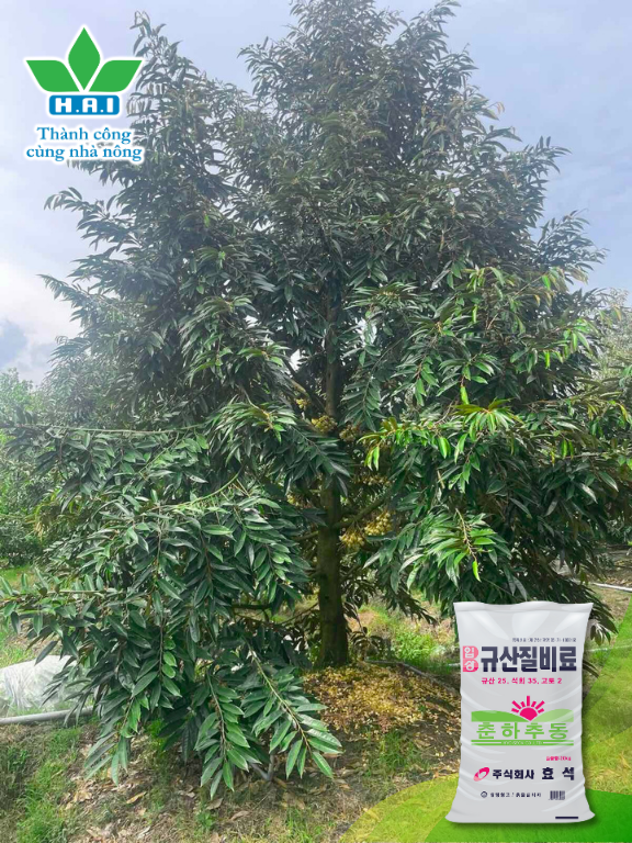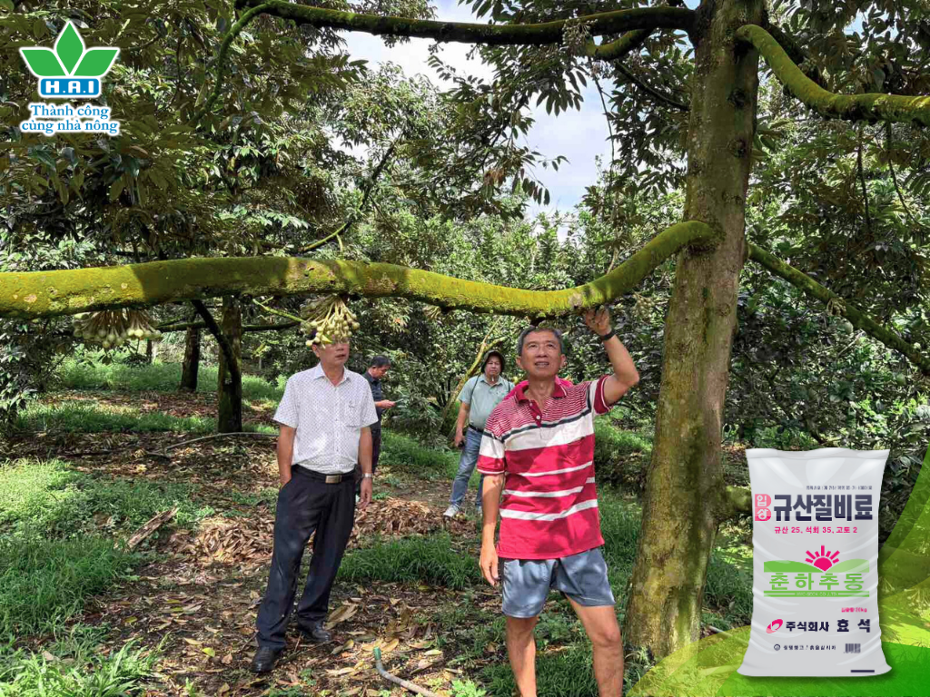 • Vườn sầu riêng Ri 6 của anh Nhơn đang đoạn sau ra hoa - đây thời điểm quan trọng để định hình năng suất. Và trong giai đoạn xử lý ra hoa, nhà vườn đã sử dụng phân bón HAI - Silicate Calcium (SCF) của HAI, ghi nhận kết quả sau 14 ngày sử dụng thì các cây trong vườn ra hoa tập trung hơn rõ, nụ mập khỏe và lá xanh dày, bóng mượt