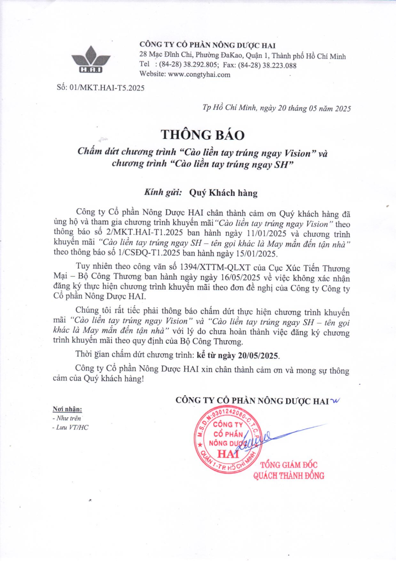Công ty cổ phần Nông dược HAI thông báo về việc kết thúc hai chương trình khuyến mãi: "Cào liền tay trúng ngay Vision" và "Cào liền tay trúng ngay SH" kể từ ngày 20/05/2025.