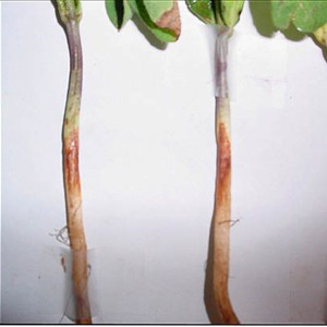 - Cây con bị ngã ngang nhưng lá vẫn còn xanh, gốc thối nâu và teo tóp lại;