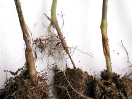 - Trên cây lớn, rễ và vỏ ở phần thân sát gốc bị thối nâu, các vết bệnh lõm vào và có viền không đều đặn, sau đó thân bị nứt ra, lá héo khô rồi rụng dần.