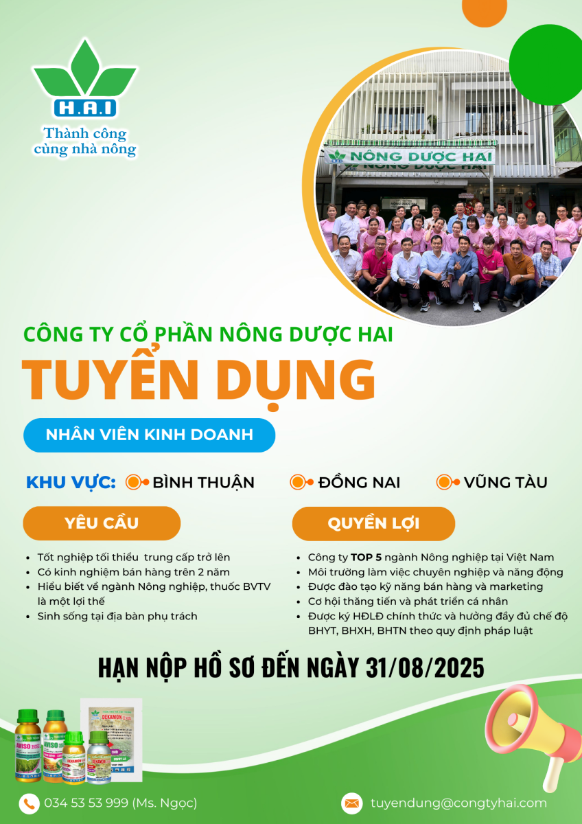 - viên Sales (Mảng thuốc BVTV): Thu nhập từ 15 TRIỆU + Thưởng KPI +++