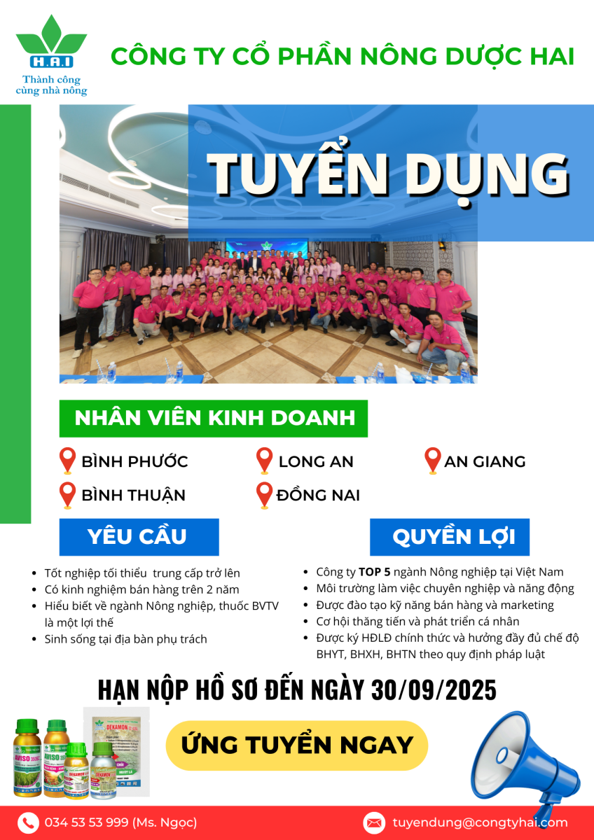 Do nhu cầu mở rộng kinh doanh, HAI đang cần tuyển thêm vị trí: NHÂN VIÊN KINH DOANH (Mảng thuốc BVTV) Địa bàn tuyển dụng: Bình Phước, Long An, An Giang, Bình Thuận, Đồng Nai